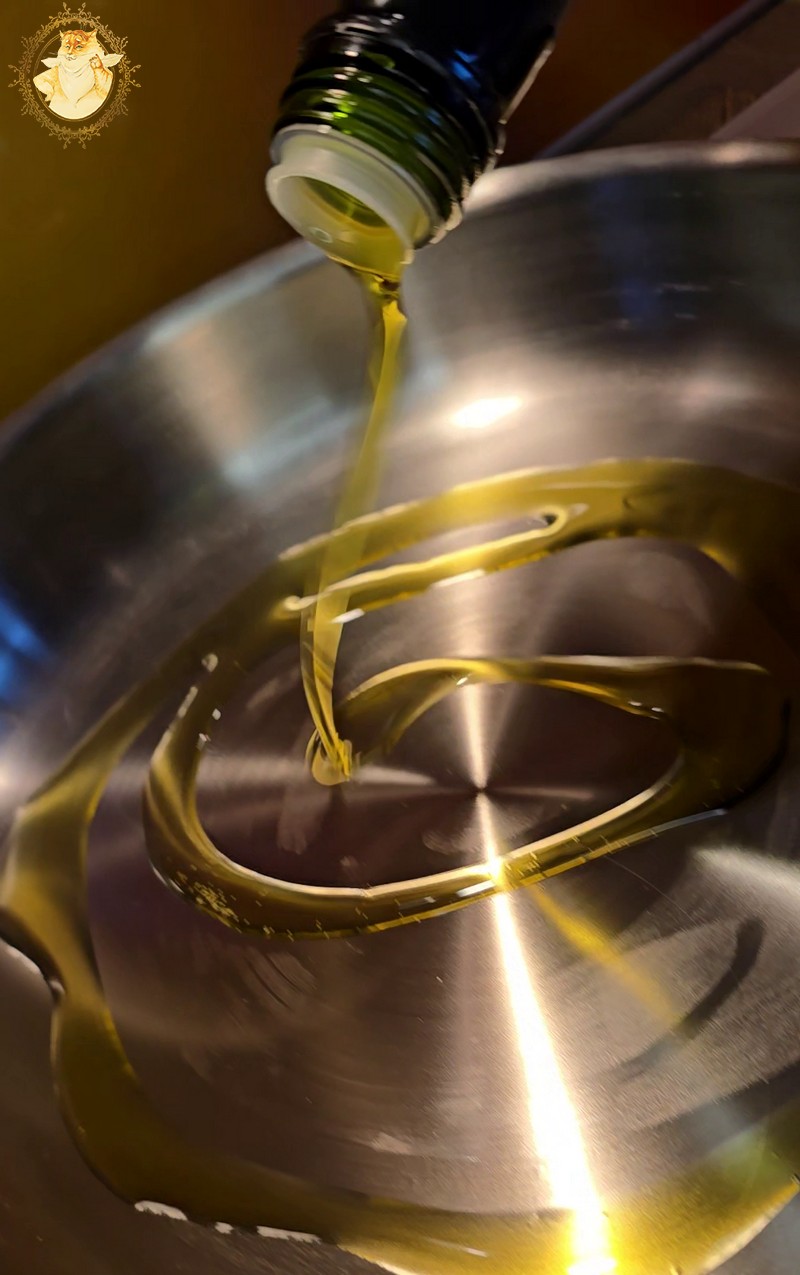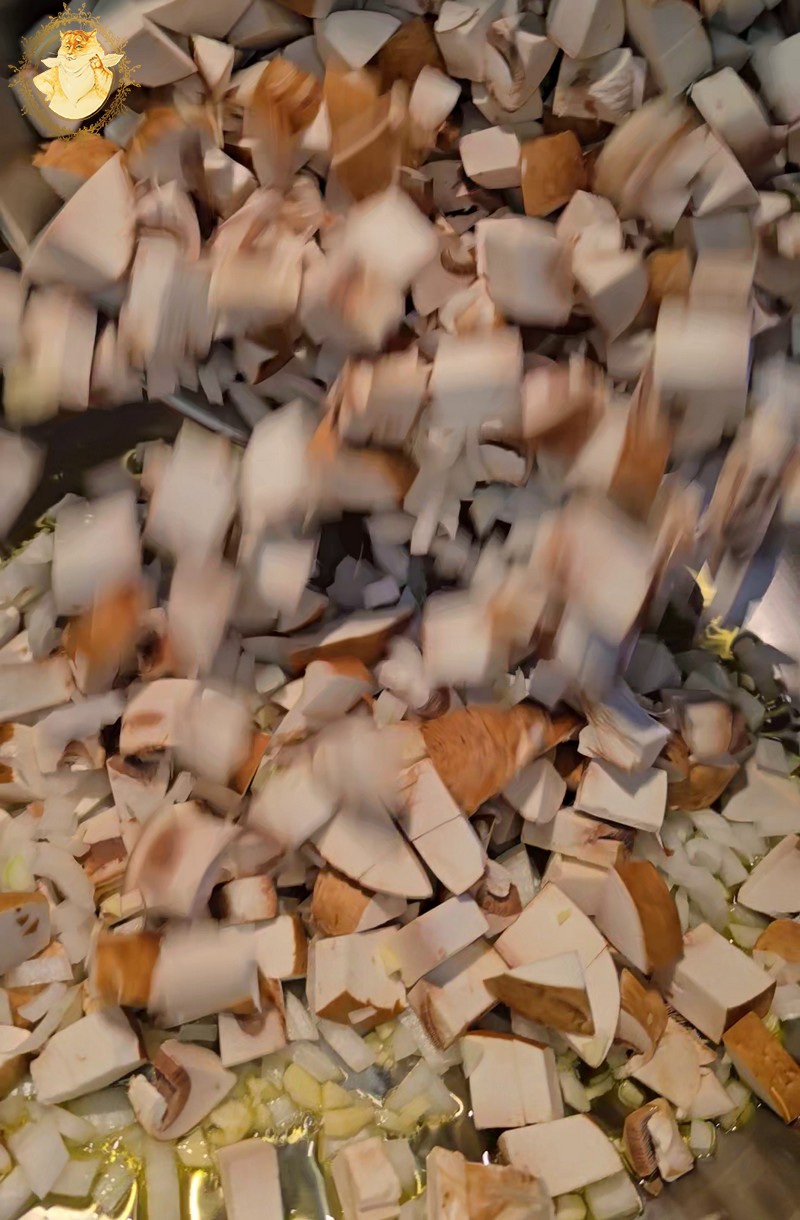 Į įkaitintą keptuvę įpilame aliejaus, ir apkepiname grybus, svogūnus ir česnakus.