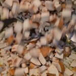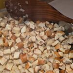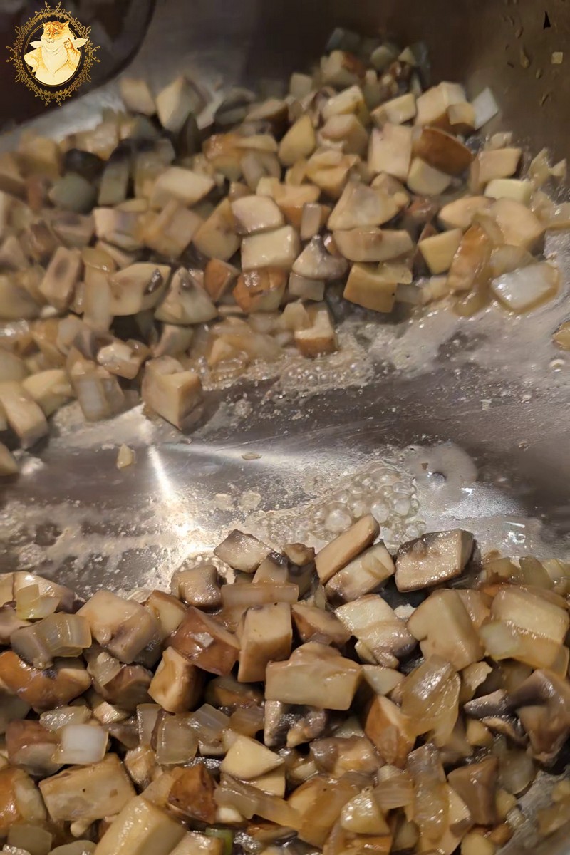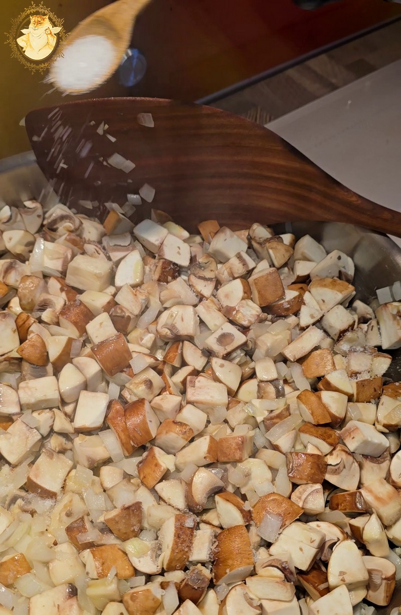 Nebijokite kepdami laikyti aukštesnę temperatūrą, nes mums reikia išgarinti grybuose slypinčią drėgmę, bet tuo pačiu vis pamaišykite mentele, kad neprisviltų.