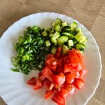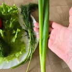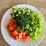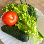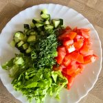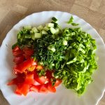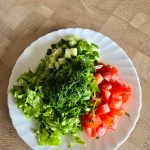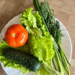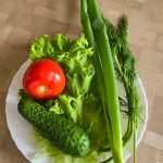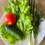- surinkti daržoves tradicinėms salotoms (salotų lapai, pomidorai, agurkai, svogūnų laiškai ir krapai).