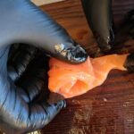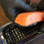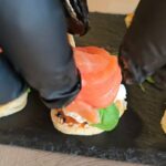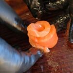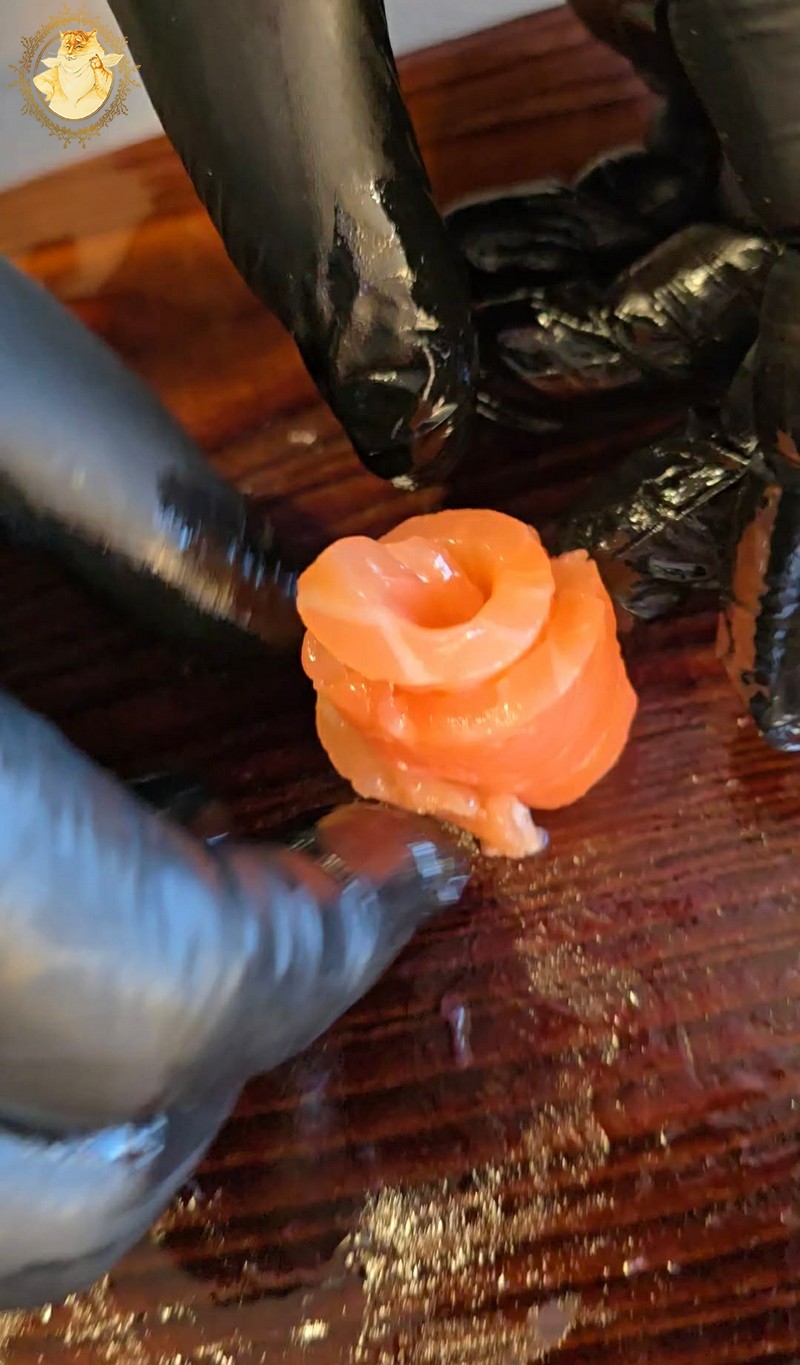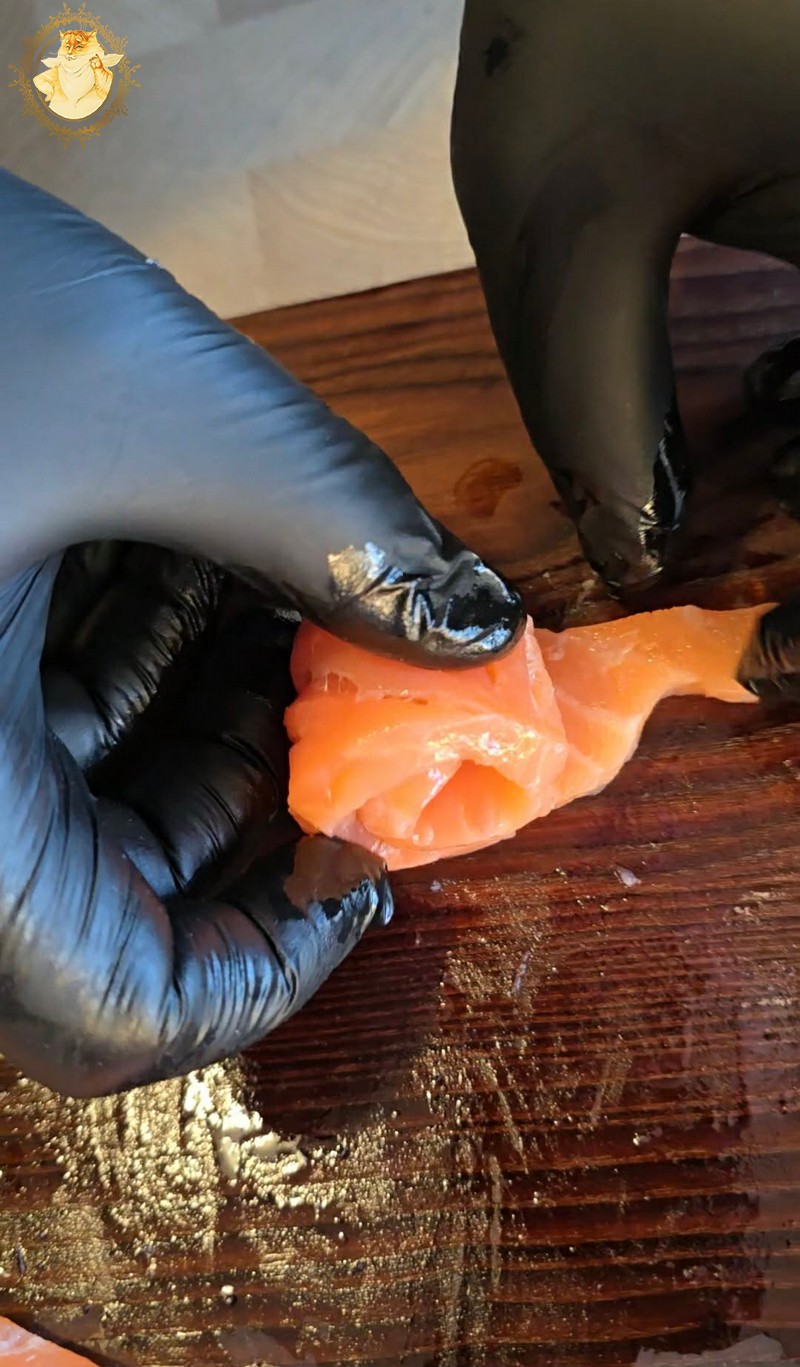 Kol iškepę šaukšteliai vėsta, supjaustę lašišą siauromis juostelėmis susuksime iš jų rožyčių.