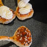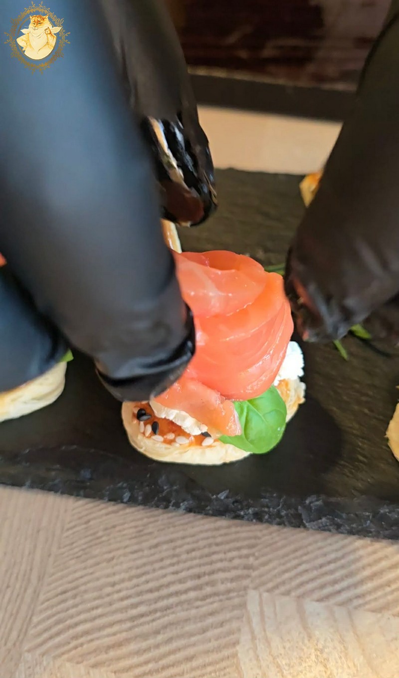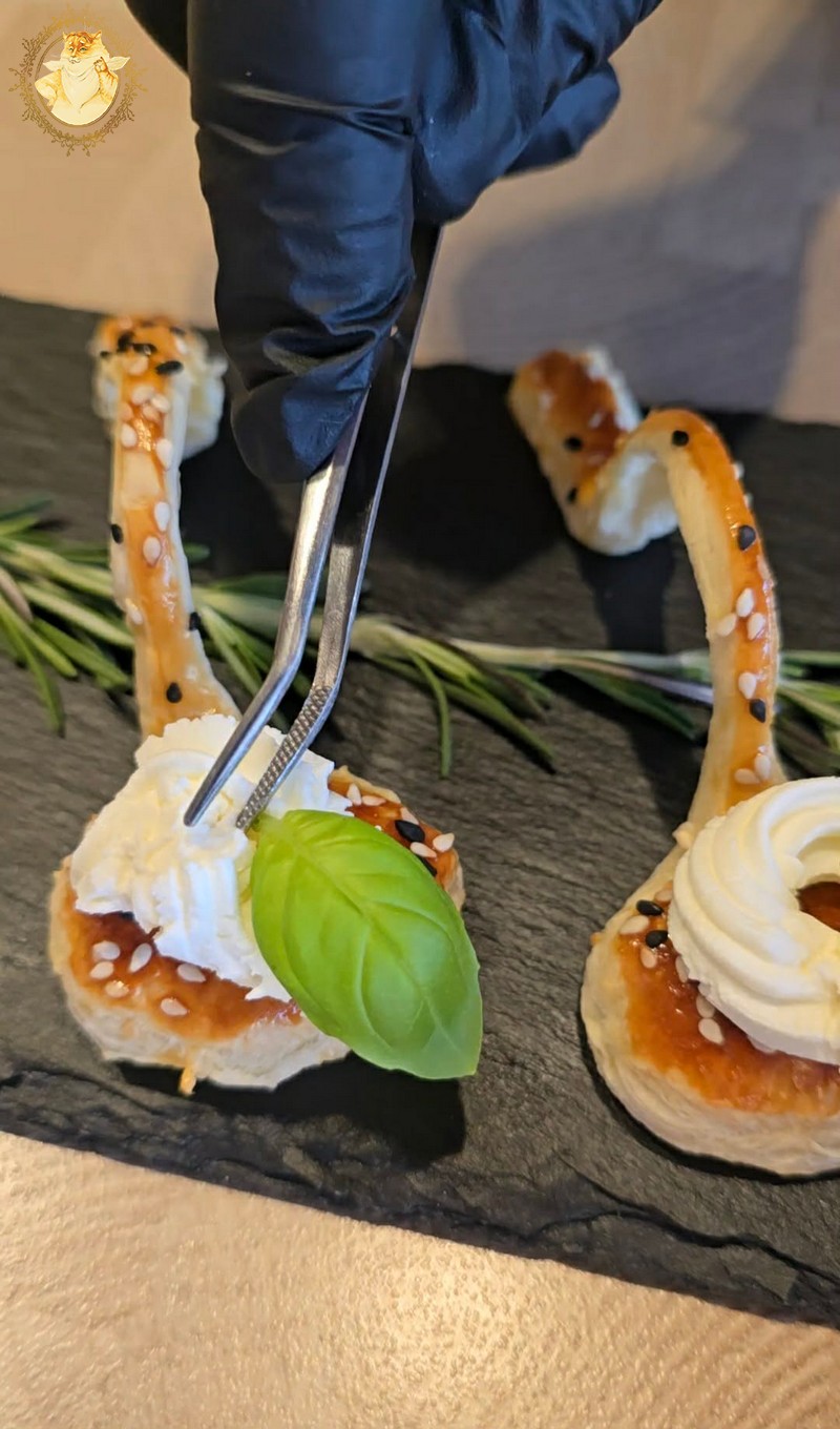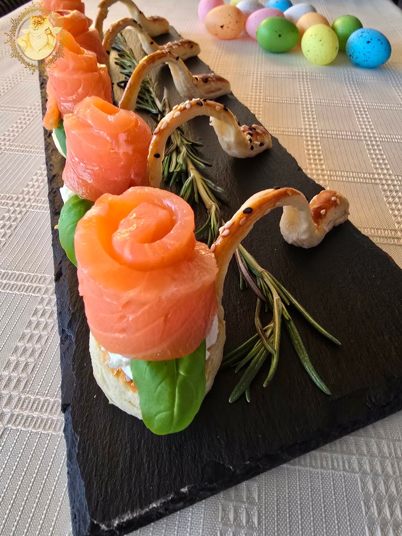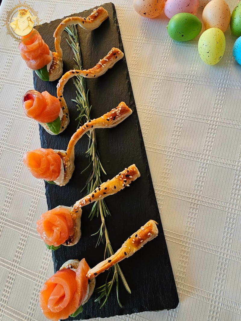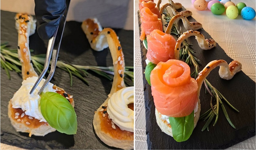 Gamybos procesą baigsime ant šaukštelių uždėję tepamo sūrio, papuošę baziliko lapeliais, kuriuos prispausime rožės žiedais iš lašišos.