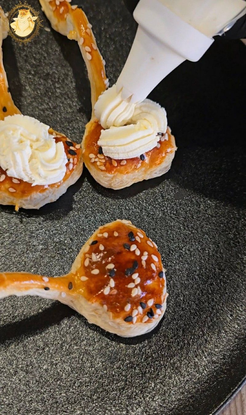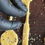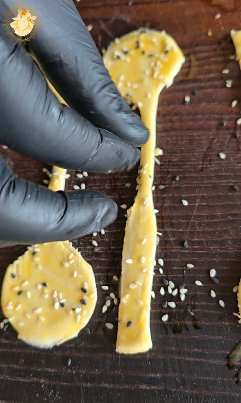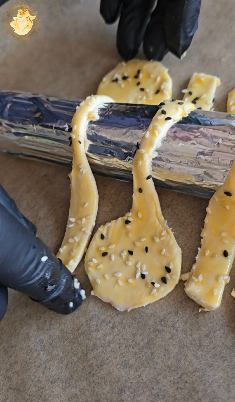 Juos sutepame kiaušinio trynio plakiniu ir pabarstome sezamo sėklomis.