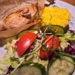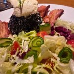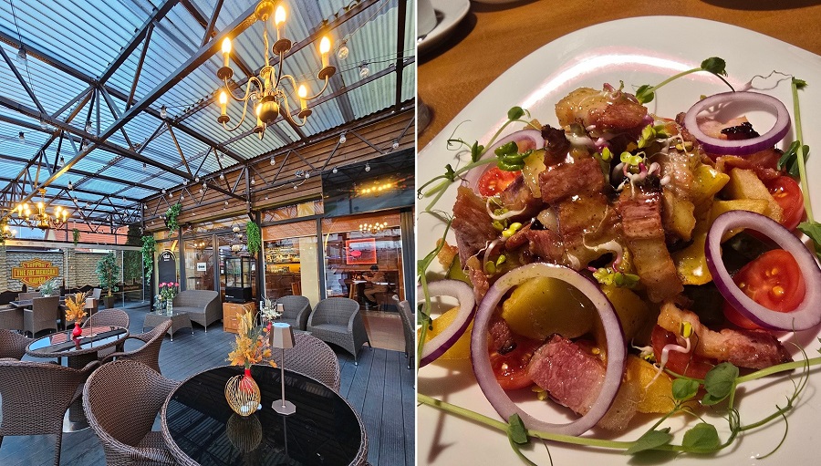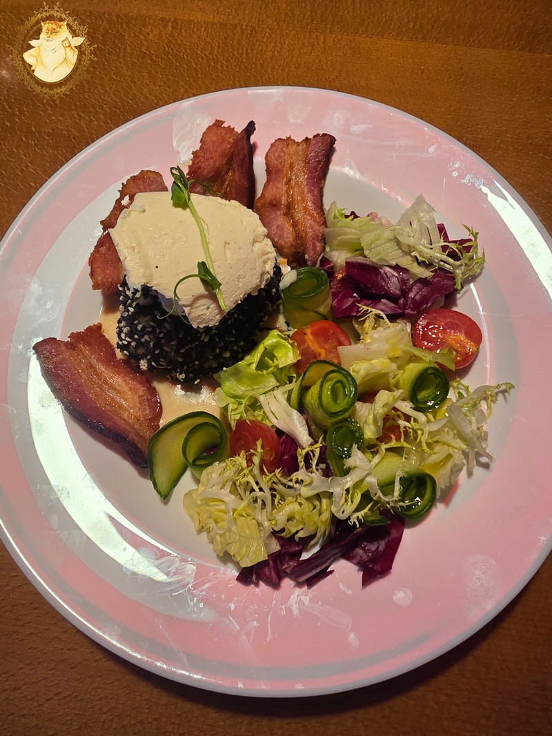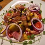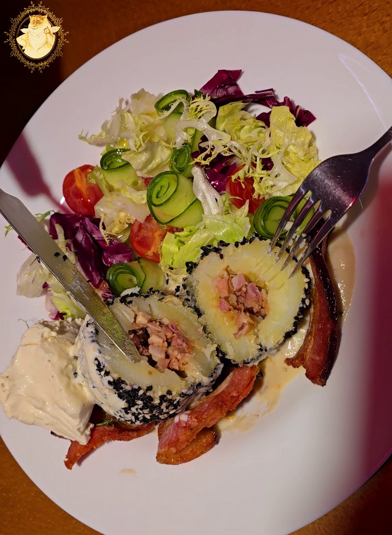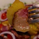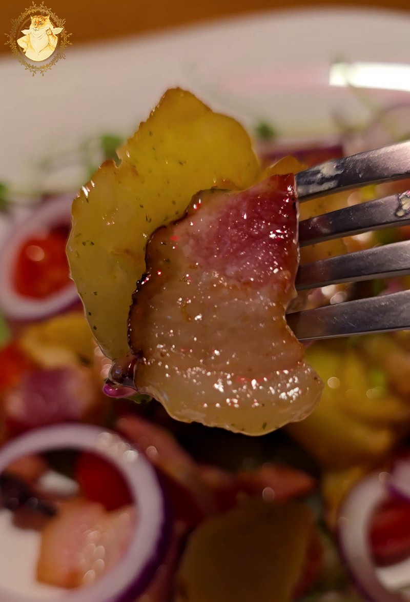 Apkepta šoninė su bulvytėmis, toks iki skausmo kiekvienam lietuviui pažįstamas patiekalas. O šiame bare jam suteiktas „tiuningas” gardinant šį patiekalą pomidoriukais ir raudono svogūno griežinėliais šį patiekalą paverčiant įspūdingomis salotomis.