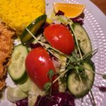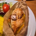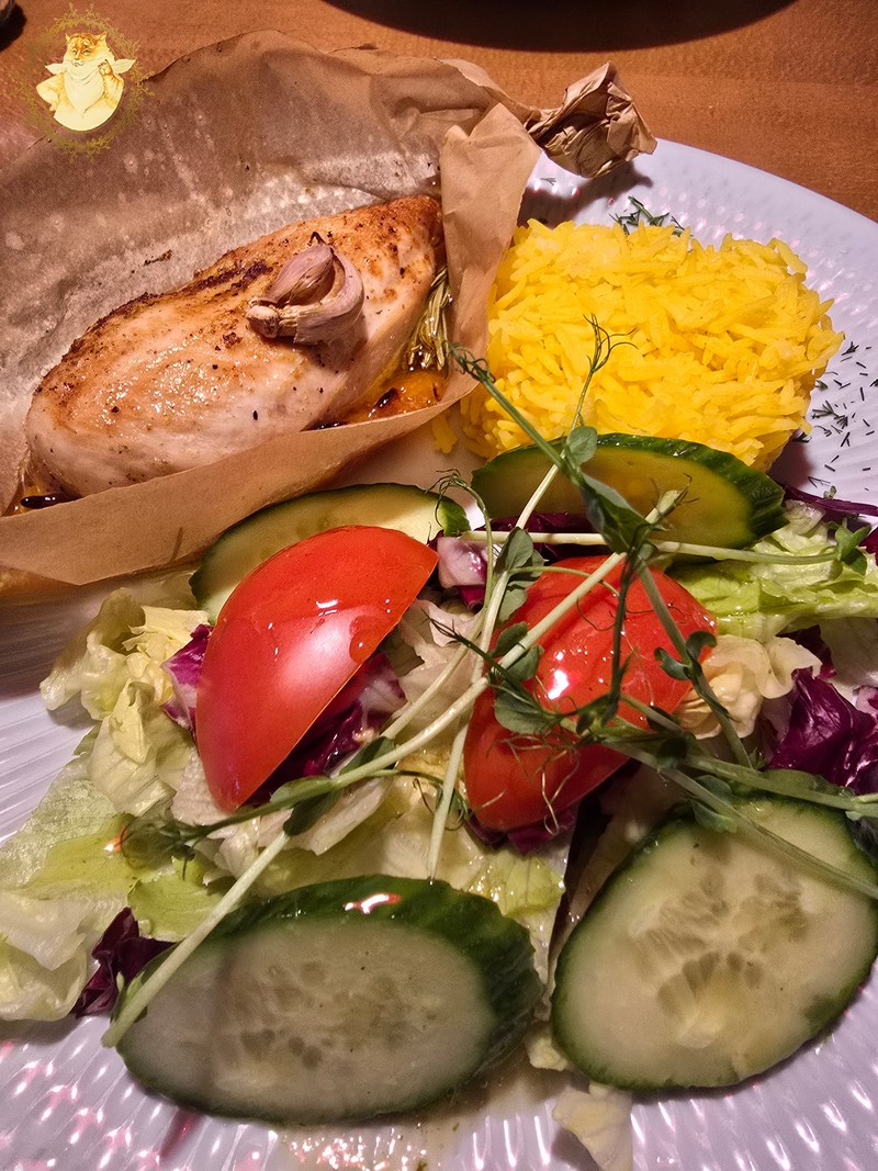 Mama iš pagrindinių patiekalų buvo išsirinkusi vištieną apelsinų padaže. Paragavęs vištienos galiu pasakyti, kad vištiena neperkepta, sultinga, jaučiamas lengvas apelsinų salstelėjimas.