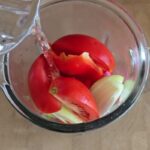 Paprikas, svogūnus ir pomidorus supjaustę į keturias dalis, sutrinkite smulkintuvu. Į smulkintuvą įpilkite šiek tiek vandens prieš pradedant smulkinti daržoves.