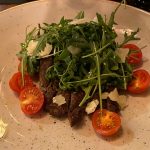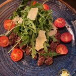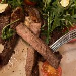 Žvelgdami į kepsnių nuotraukas jūs, spėju, visi užsiduosite klausimų, o kur gausesnis garnyras. Paminėsiu, kad šiame restorane bulvių košę arba gruzdintas bulvytes galima užsisakyti atskirai, ir tai papildomai kainuoja 2,70€. Bet kai kepsnių kainos svyruoja ties 20€ ir aukščiau, tie keli eurai nebeturi didelės reikšmės. Bulvių nenorėjom, nes vakarieniavome vėlai, o ir bulves kaip garnyrą pastaruoju metu tik paskanaujame, nes, liaudiškai tariant, bandome sėsti „ant dietos“.