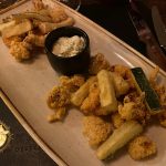Alaus nuotraukų nebus, bet vieną užkandį, tinkantį būtent prie alaus, tą vakarą mes testavome. Ir tai buvo venecijietiškai kepti kalmarai, krevetės, cukinijos ir baklažanai. Nors viską gaubė plonytė traški tempura, o patį užkandį atlydėjo padažas, man jį skanaujant ir užgeriant alumi toks derinys pasirodė tinkamiausias.