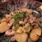 Bent kiek labiau prisikabinti prie patiekalų ir pateisinti restoranų žudiko vardo neleido man ir kiti du užkandžiai. Aštuonkojo salotos su virtomis mažosiomis bulvytėmis į kompaniją buvo be bazilikų pasiėmę ir salierą. Tai jei norėčiau puoselėti bjauraus restorano kliento įvaizdį, tai padavėjai būčiau pasakęs būtent priekaištą dėl nederančių salierų. Bet tai, kad man ne visada įtinka salierai, kaltas aš, o ne šį patiekalą kūręs virtuvės šefas.