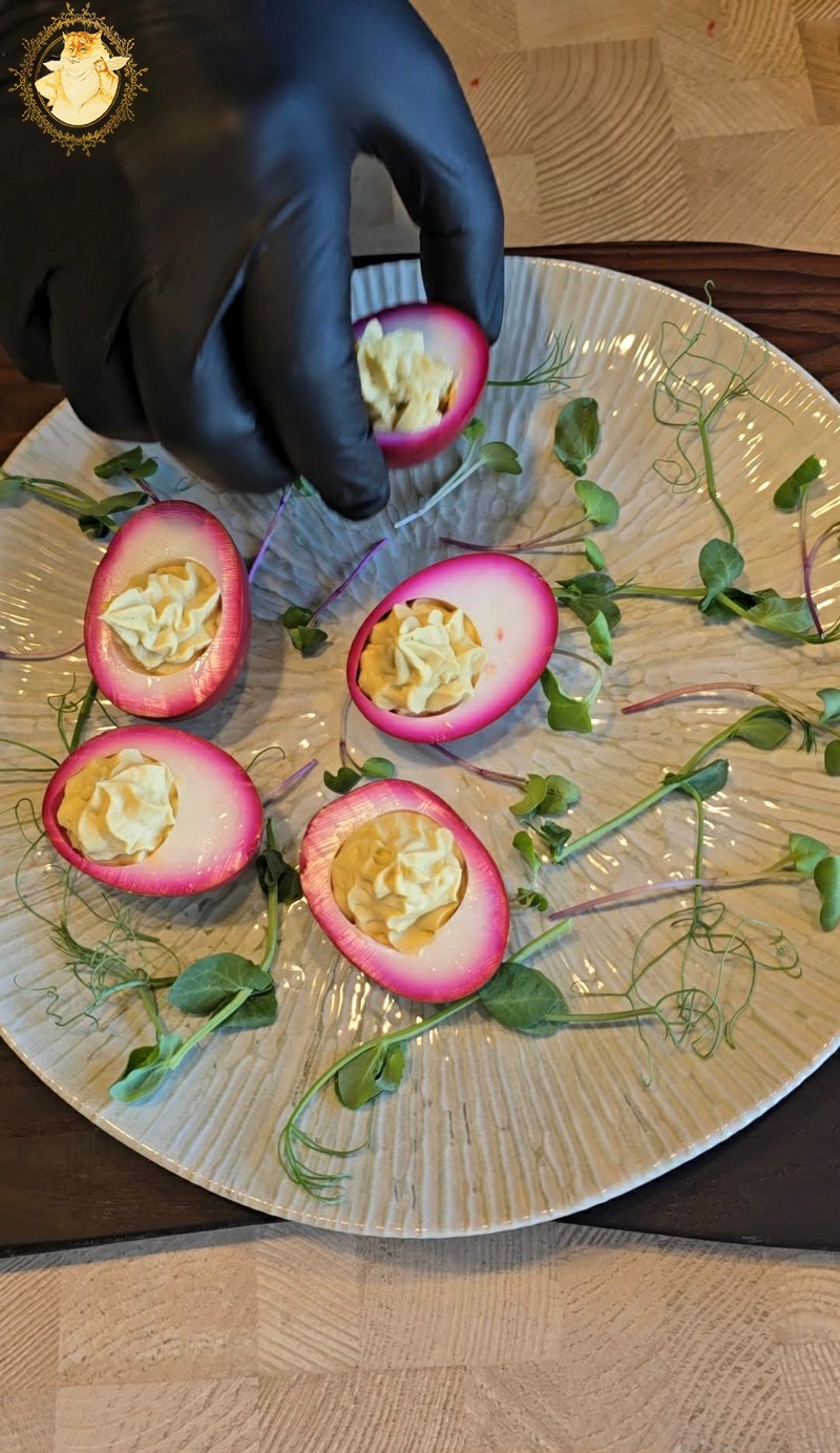 Pagaminta mase įdarykime kiaušinius. Lėkštę puoškite norimais žalumynais ir tada tiekite ant šventinio stalo.