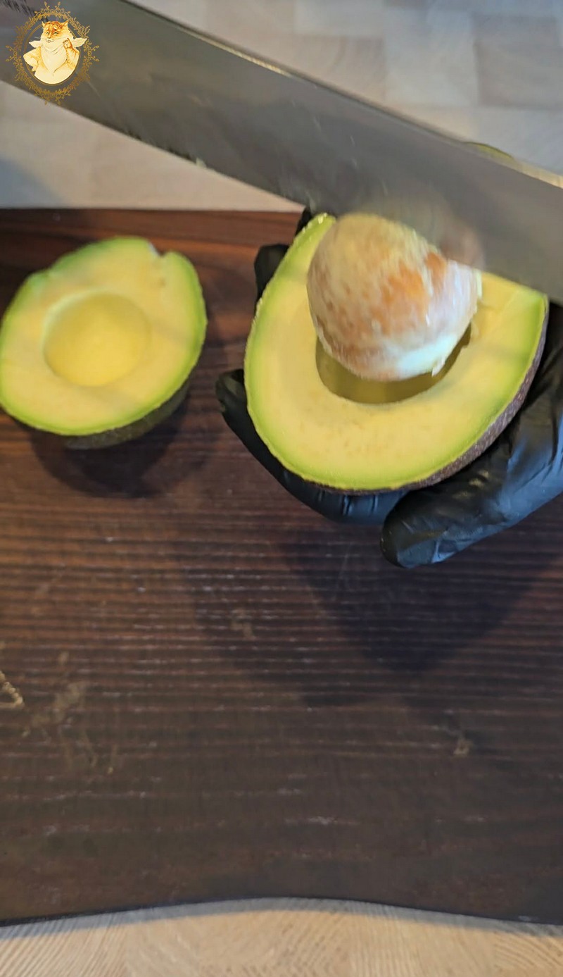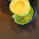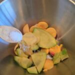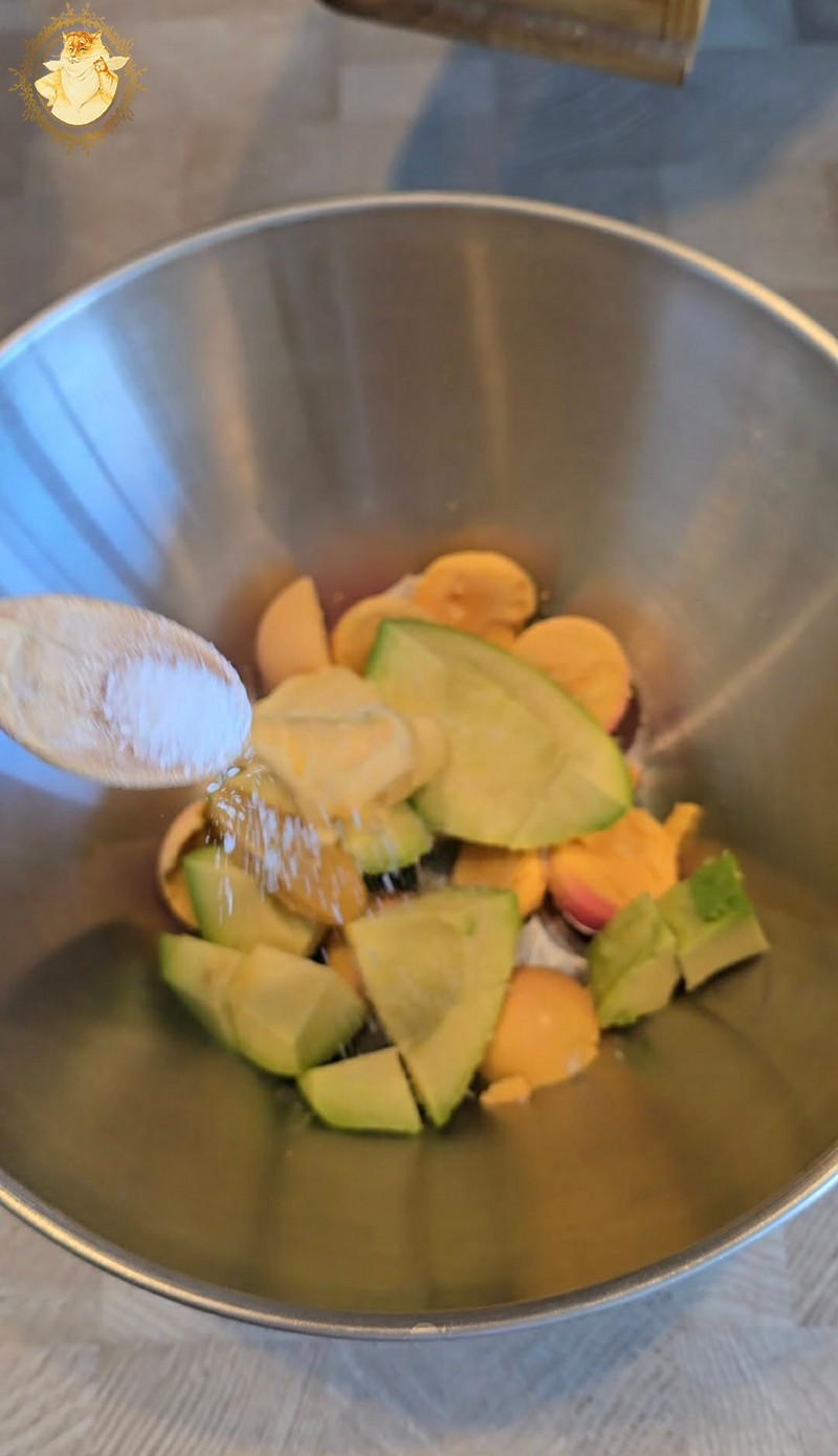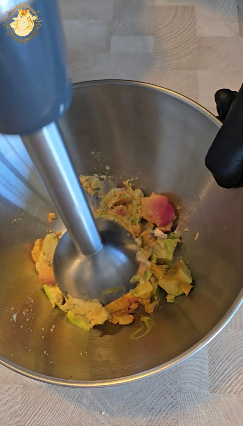 Į indą kuriame sudėjome atskirtus trynius, įdėkime supjaustytą avokadą.