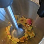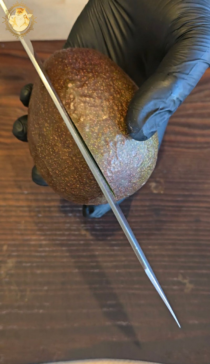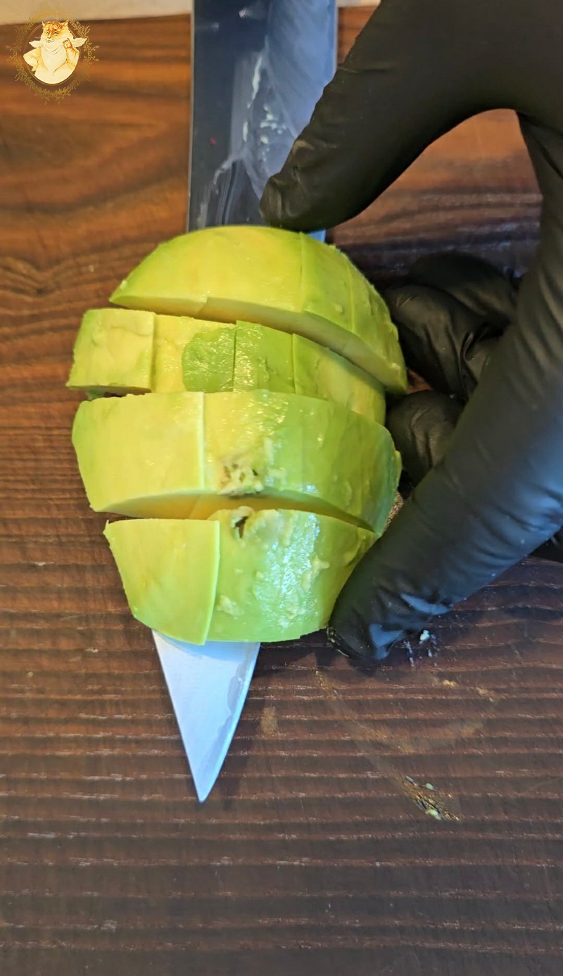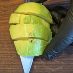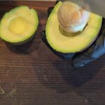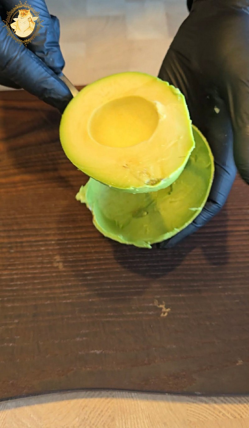 Į indą kuriame sudėjome atskirtus trynius, įdėkime supjaustytą avokadą.