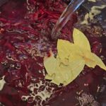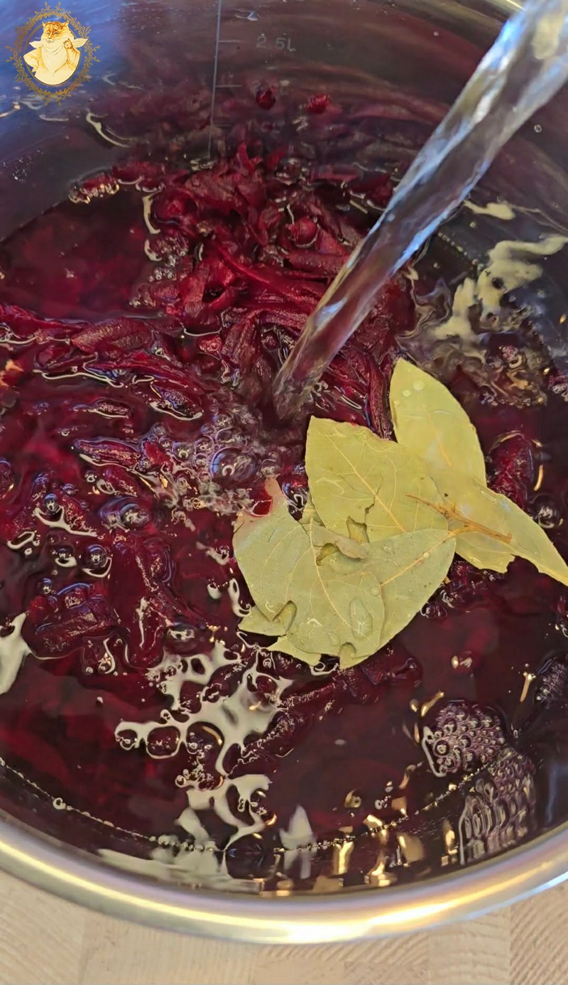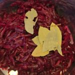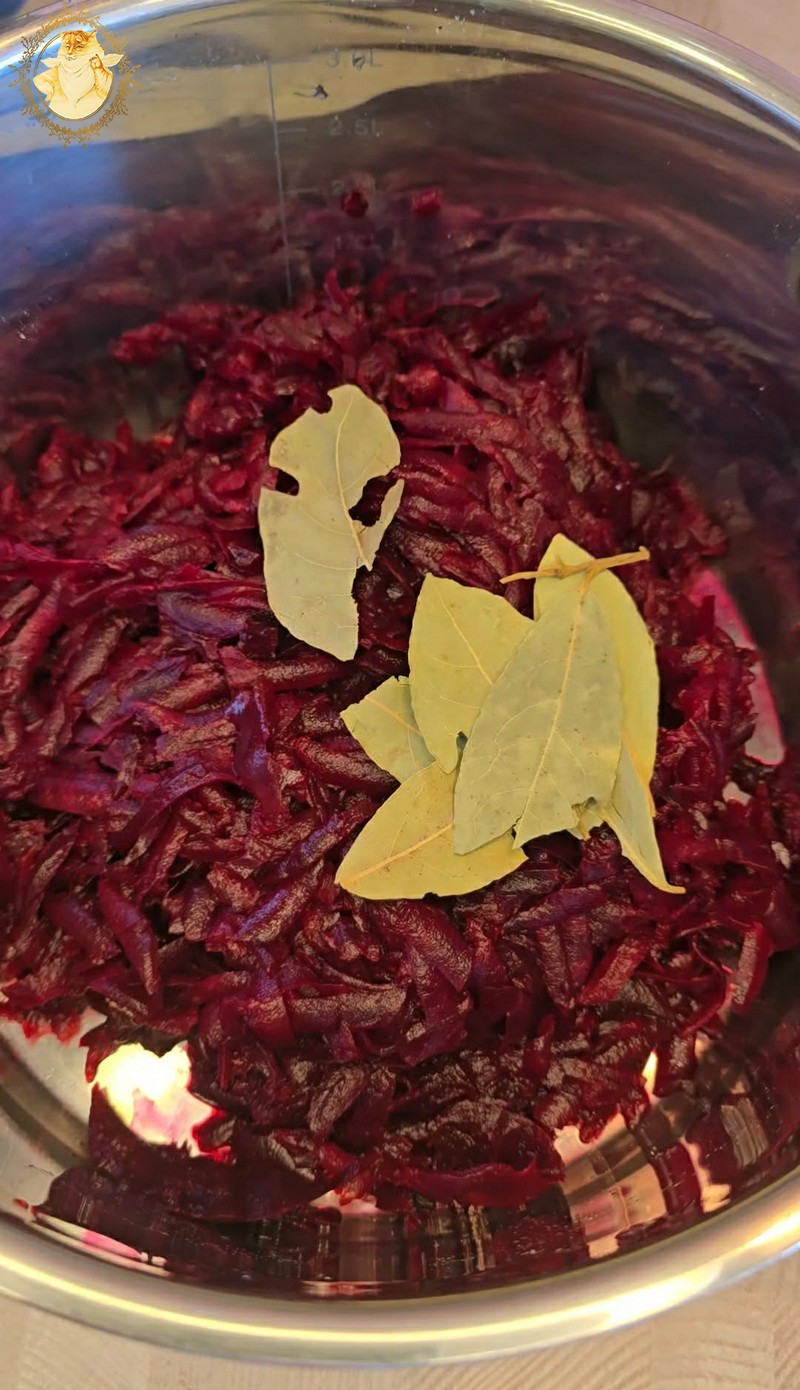 Burokėlius sutarkuojame ir sudėję lauro lapus, užpylę vandens, kelias minutes paverdame, kol burokėliai išskirs daugiau spalvos.