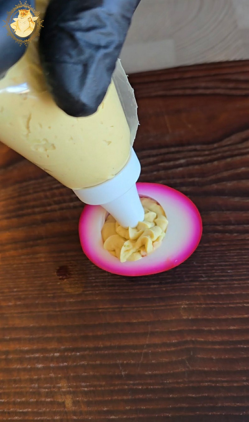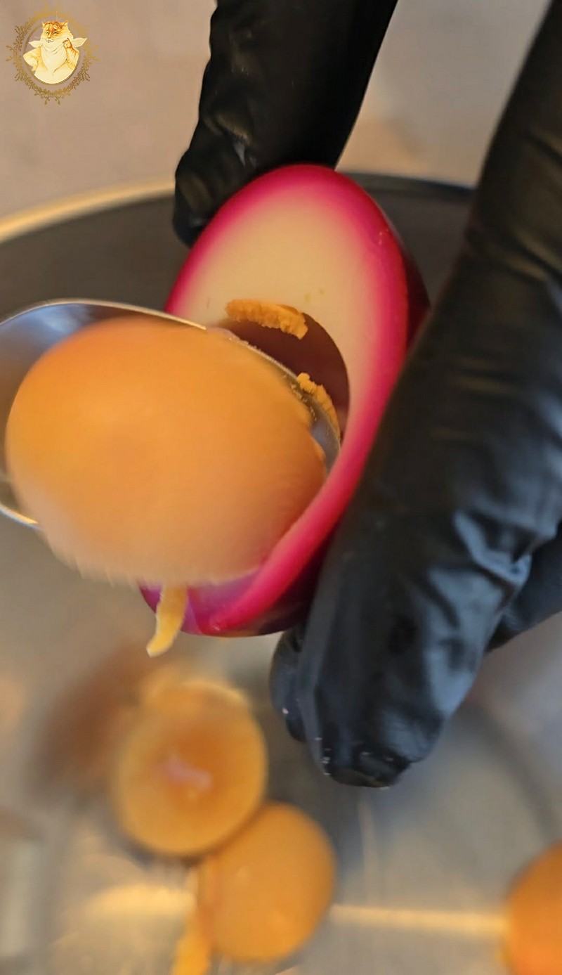 Kitą dieną išėmę ir nusausinę kiaušinius, juos perpjovę atskiriame trynį.